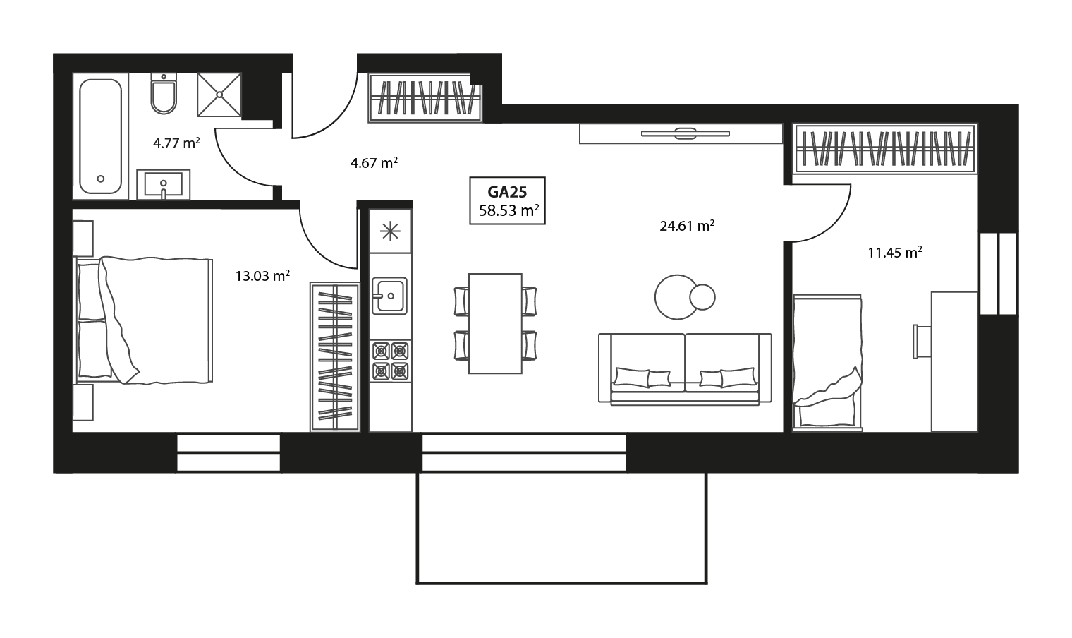 GA25 3 kambariai Plotas: 58.53 m2 Aukštas: 2 Kryptis: Pietūs Apdaila: Dalinė Laisvas
