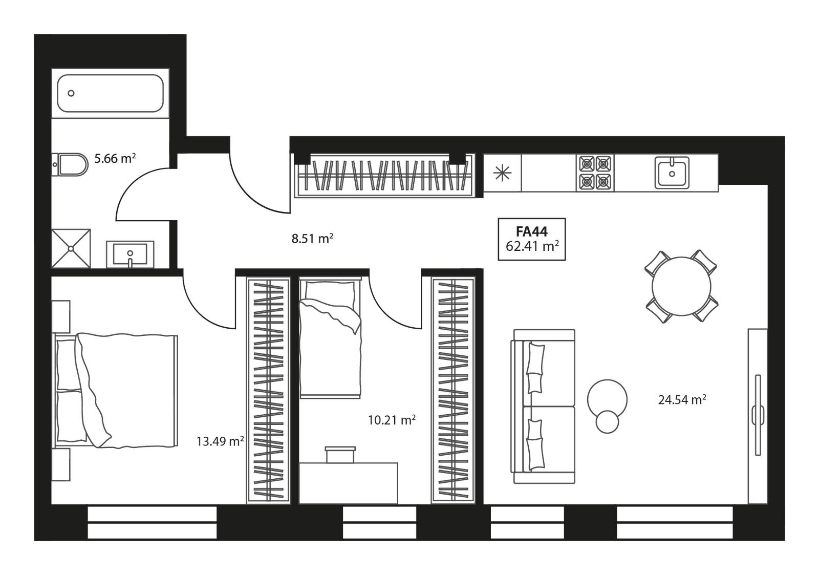 FA44 3 kambariai Plotas: 62.41 m2 Aukštas: 4 Kryptis: Rytai Apdaila: Dalinė Laisvas