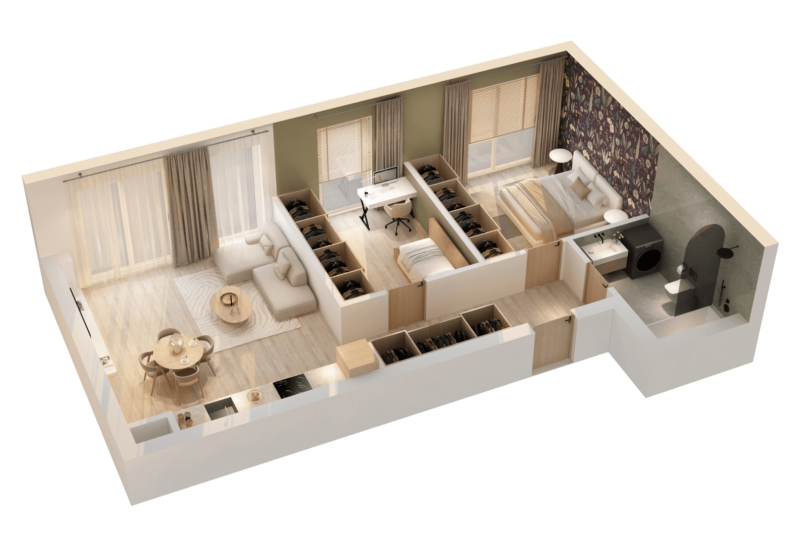 FB33 2 kambariai Plotas: 43.38 m2 Aukštas: 3 Kryptis: Rytai Apdaila: Dalinė Rezervuotas