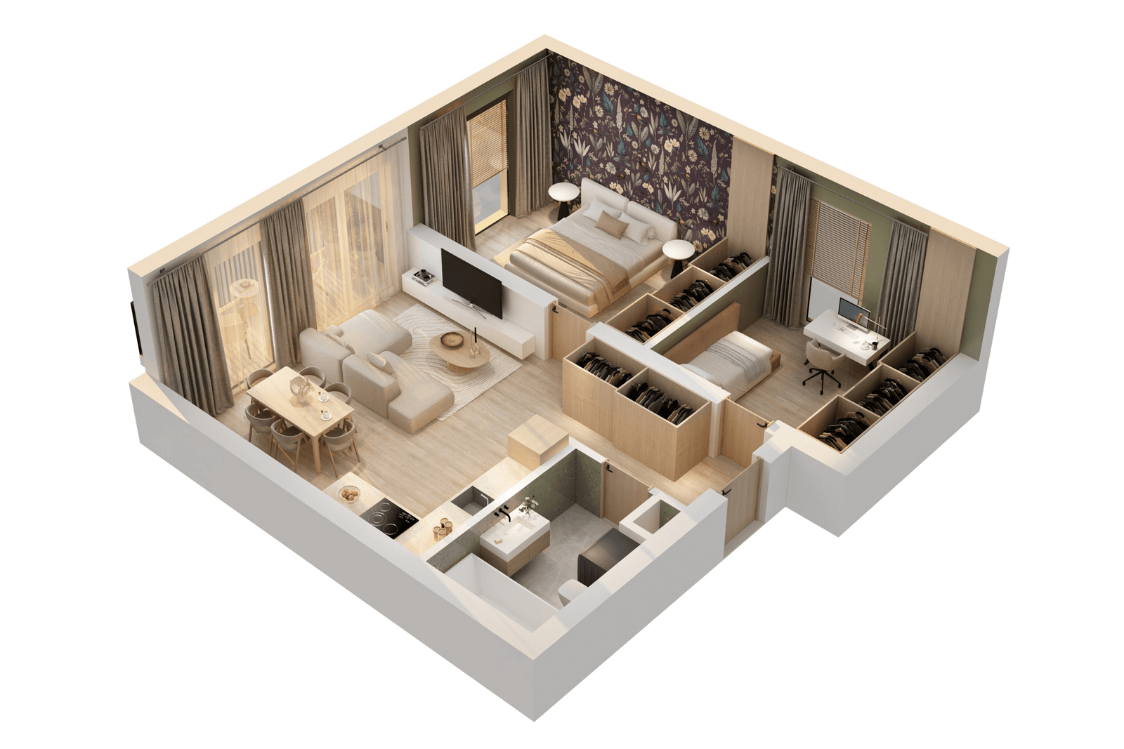 FB17 2 kambariai Plotas: 52.75 m2 Aukštas: 1 Kryptis: Vakarai Apdaila: Dalinė Laisvas