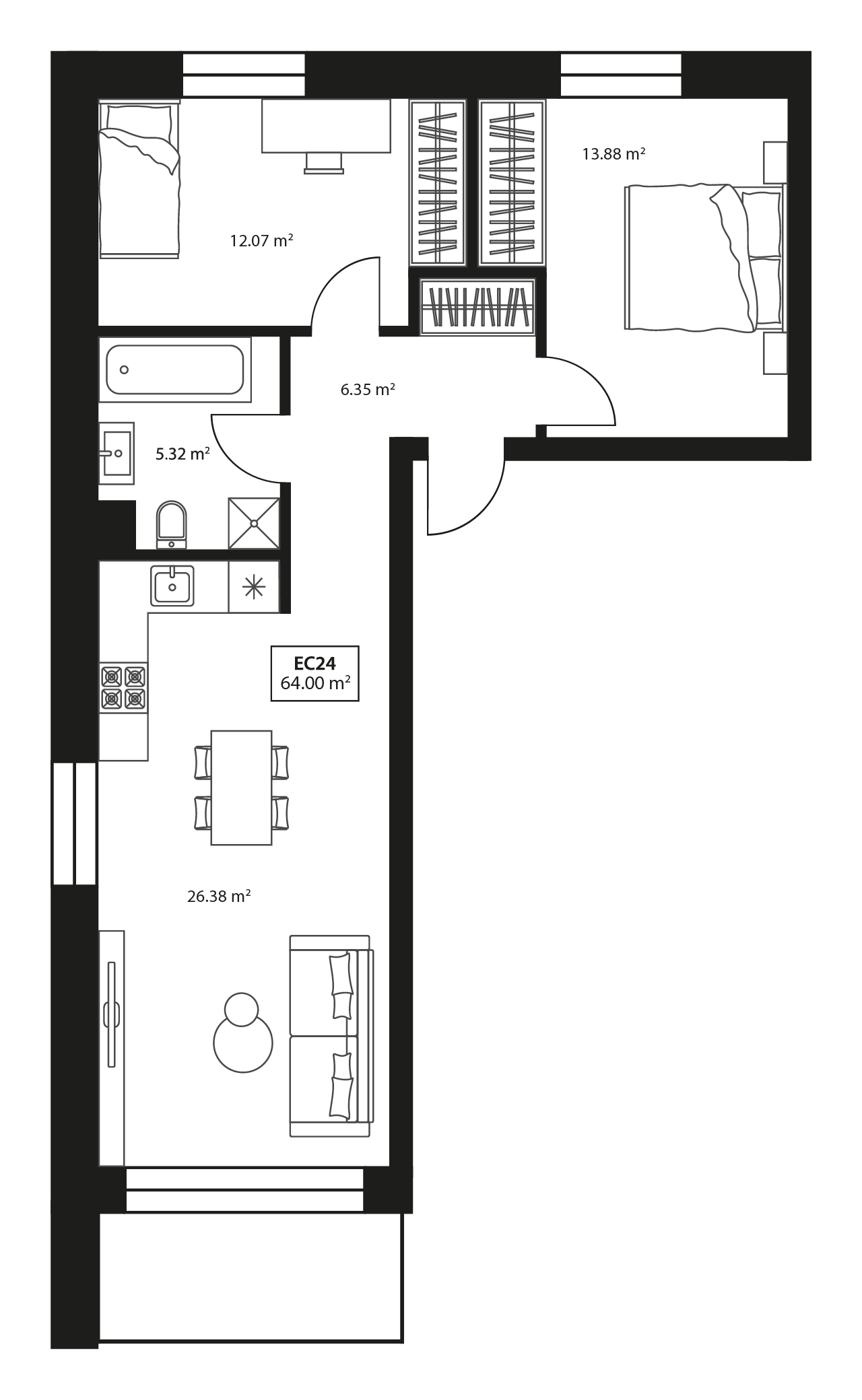 EC14 3 kambariai Plotas: 64.09 m2 Aukštas: 1 Kryptis: Pietūs, rytai Apdaila: Dalinė Laisvas