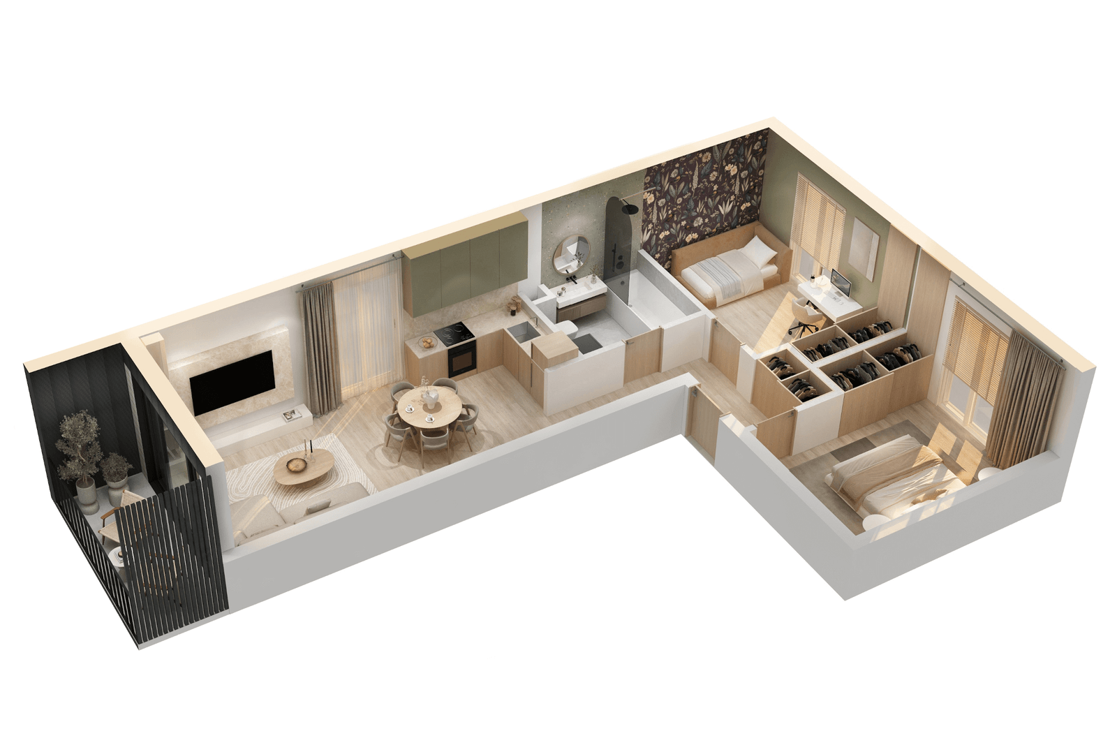 EC12 2 kambariai Plotas: 46 m2 Aukštas: 1 Kryptis: Pietūs, rytai Apdaila: Dalinė Laisvas
