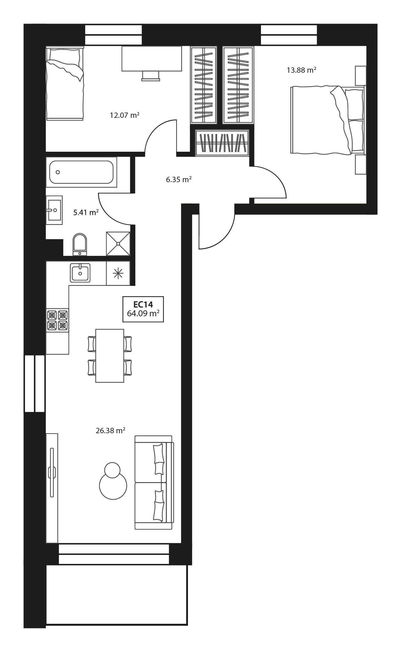 EC14 3 kambariai Plotas: 64.09 m2 Aukštas: 1 Kryptis: Pietūs, rytai Apdaila: Dalinė Laisvas